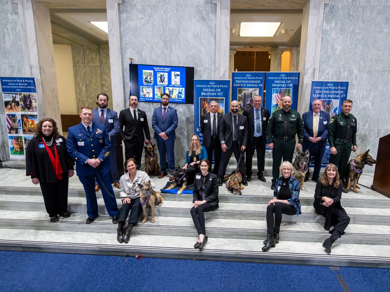 (Washington, D.C. – March 13, 2024) The Fourth Annual Animals in War & Peace Medal Ceremony honored seven extraordinary canines on March 6, 2024, at the Rayburn House Office Building in Washington, DC whose achievements made a significant impact in both times of war and peace. Members of Congress presented each animal with a medal to recognize its courage and sacrifice to the United States. Great Britain is the only country that currently recognize our American animals in times of war and peace.